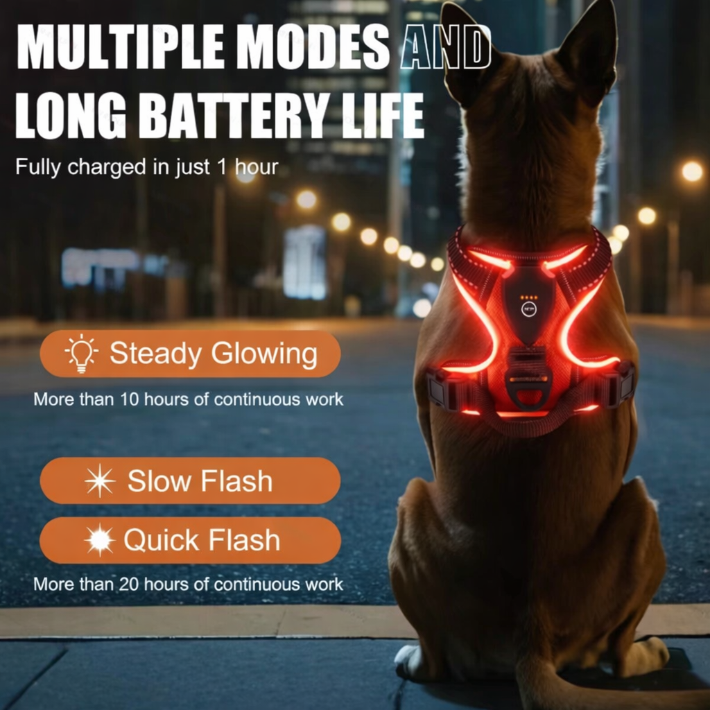 ⭐⭐⭐⭐⭐ Bright, durable and easy to use The three light modes are fantastic — we usually use the slow flash setting. It charged quickly and lasted for several evening walks before needing another charge. The harness feels strong and very well made.- Archer M